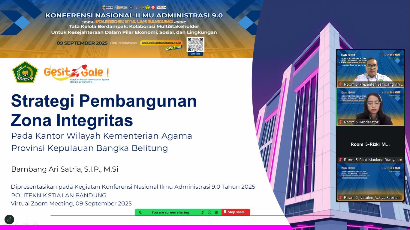 PANGKALPINANG, BERITA-FAKTA.COM – Prestasi membanggakan kembali ditorehkan oleh Aparatur Sipil Negara (ASN) Kantor Wilayah Kementerian Agama Provinsi Kepulauan Bangka Belitung. Pada KNIA (Konferensi Nasional Ilmu Administrasi) 2025 yang digelar Politeknik STIA LAN Bandung secara Virtual Zoom Meeting (9/9/25), ASN Kemenag Babel, Bambang Ari Satria berhasil menjadi presenter dengan memaparkan paper terkait Strategi Pembangunan Zona Integritas (ZI).
